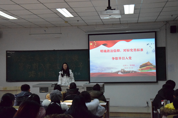新闻网讯(通讯员于添政)为加强保障入党积极分子的培训工作,进一步提高入党积极分子的思想认识,端正入党动机,打牢理论基础。3044AM永利集团官网分党校第六期入党积极分子培训班“明确政治信仰、对标党员标准”专题党课于12月13日在南湖校区科研楼2114开展。本次党课由公司员工党支部书记、2019级辅导员李秀绒老师主讲。