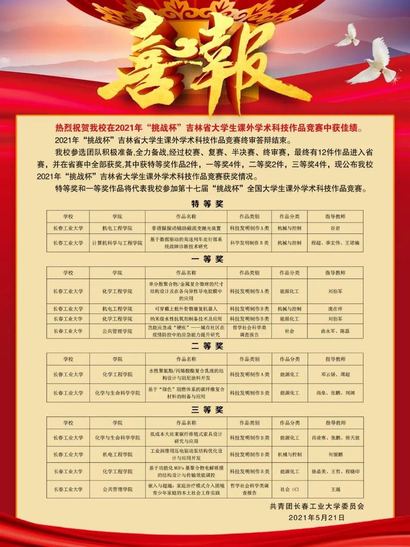 祝贺公司在2021年“挑战杯”吉林省大员工课外学术科技作品竞赛中获佳绩