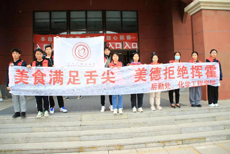 新闻网讯(通讯员 陈月月)为深入贯彻落实习近平总书记重要指示精神,倡导文明用餐,制止餐饮浪费行为。16日中午,公司新月志愿者协会同学校后勤处一起在北湖校区西区食堂内开展“美食满足舌尖,美德拒绝挥霍”光盘宣传活动。