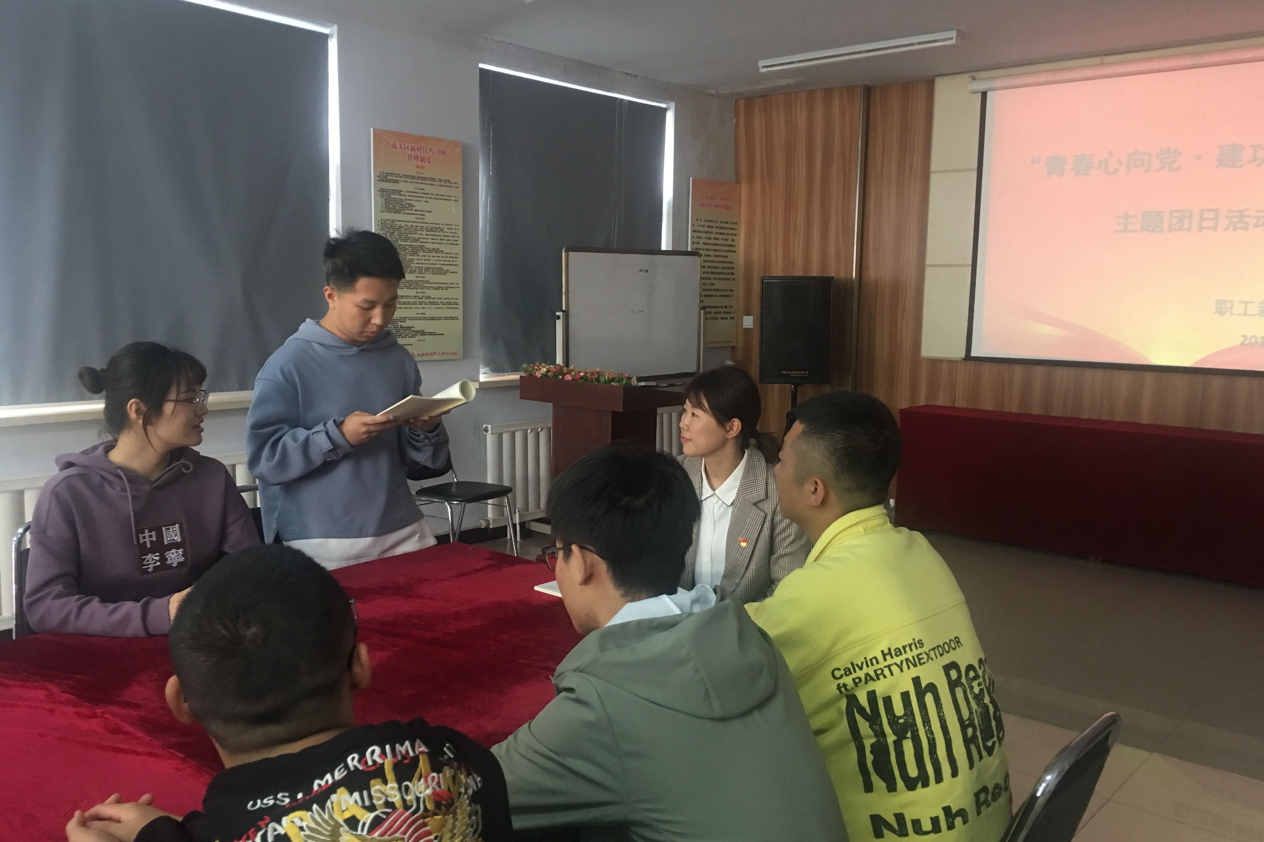 活动开始,街道团工委书记张笠与同学们共同摘读了《习近平关于青少年和共青团工作论述摘编》的相关内容,并围绕“少年兴则国兴,少年强则国强”这一主题展开讨论。他说:在新时代的节点,青年员工必须要树立远大理想、担当时代责任、积极践行社会主义核心价值观。志愿者代表欧阳丰做了以《我与祖国共奋进》为主题的国旗下演讲,动员广大青少年知荣辱、明使命、共奋进,为实现中华民族伟大复兴而不懈奋斗。今年是中华人民共和国成立七十周年,也是五四运动一百周年,员工代表刘香池主讲了《我和我的祖国》主题团课,她希望团员青年要增强“四个意识”,坚定“四个自信”,做到“两个维护”。通过学习让同学们更加深刻的体会到了以爱国主义为核心的伟大民族精神,也增强了同学们为民族复兴伟大事业而努力奋斗的决心。