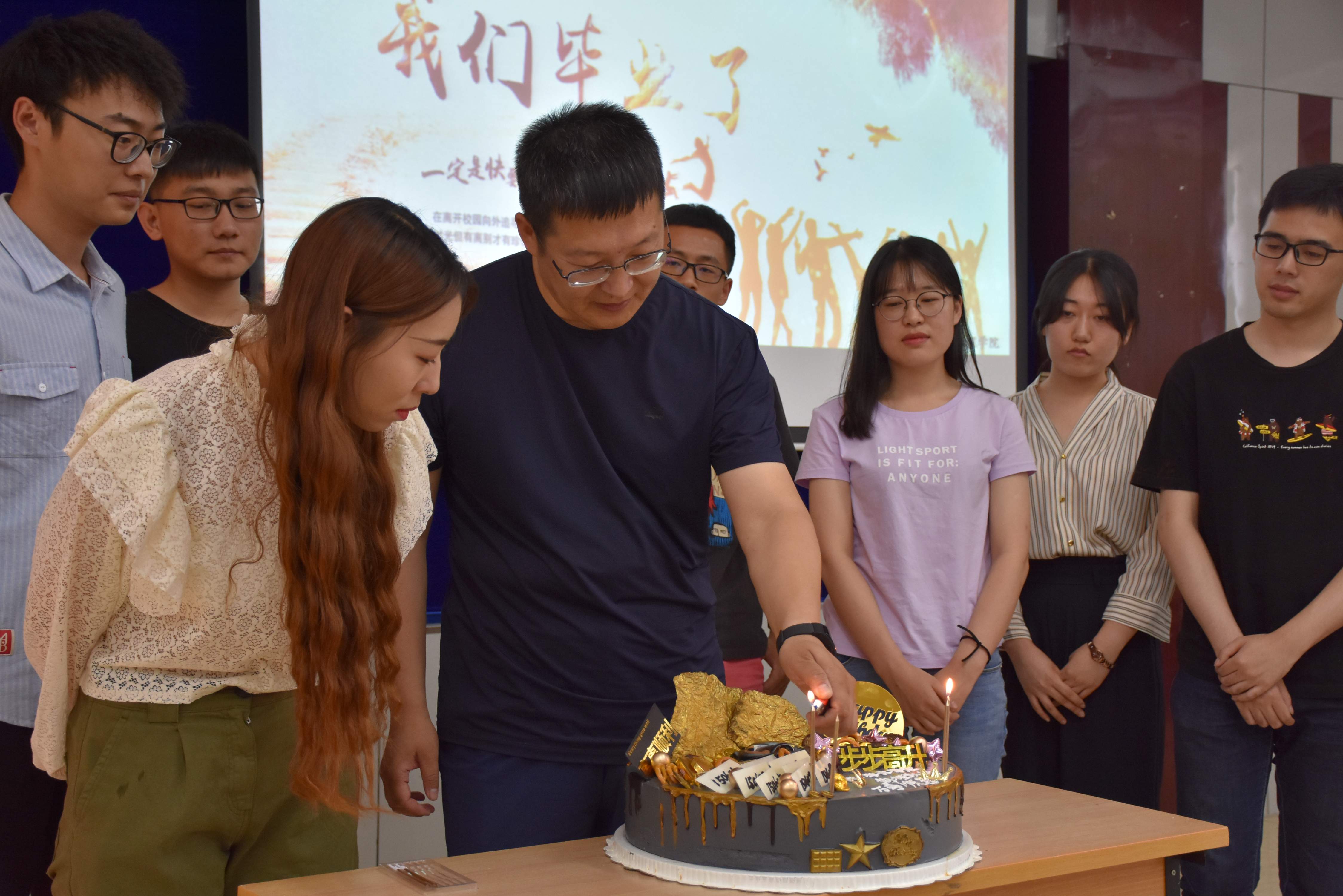 伴随着现场工大版《成都》的动听旋律,在全场同学的掌声中,毕业班的员工代表进入会场。大家首先共同观看了同学们早已准备好的送给毕业生的视频短片,一句句祝福都是对学长学姐们的感谢和预祝。2015级辅导员曹永利老师为毕业班的部分员工干部现场颁发了服务公司奖奖杯和毕业纪念册,上面2015-2019印证了同学们四年来在公司员工工作上的辛苦付出。每名授奖的同学也用一段话表达了对学校的依依不舍和对母校的热爱。随后,曹老师与毕业生回顾了在一起的四年时光,叮嘱他们不忘初心,砥砺前行,为祖国的建设贡献青春力量。最后,公司为毕业生送上了祝福的蛋糕和寓意踏上顺利征程的饺子,欢送会在全场《再见》的歌声里圆满结束。