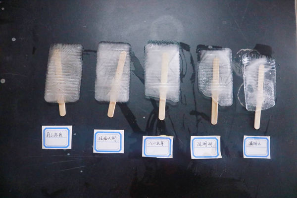 活动中,志愿者们准备好盛水容器和采样器,分成四组分别前往四个地点同时进行水样的采集,大家分工协作,高效完成采集任务。回到实验室后,对水体进行蒸馏对比,分别用浊度计和PH计进行水样检测,并将各组水样倒入模具,在零下20度的冰柜中冷冻3个小时后取出作对比,结合浊度、PH得出结论蔚山路段的水质较差。