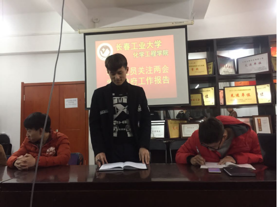 会议伊始,主持人为大家播放了关于两会的新闻视频,学习并领会“两会”的主要内容及精神,对本届“两会”中教育改革以及政府工作报告做了相关的了解与分析,并对“两会”中的教育改革进行了重点讨论,大家各抒己见,畅所欲言,现场气氛十分热烈,大家纷纷表示,要加强自身理论学习,夯实理论基础,把“两会”精神落实到学习生活的实际行动中。本次会议在热烈的讨论中圆满结束。