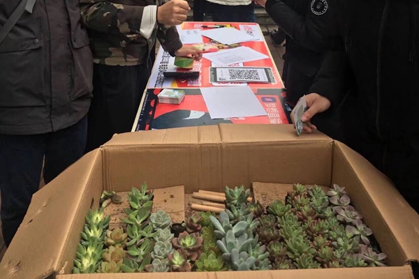 休期间,在现场工作人员的引导下,参与活动的同学们通过编辑绿色宣言分享至朋友圈后就可以领取到一盆属于自己的多肉植物的形式开展。在活动的进行中,很多同学对多肉植物产生了浓厚的兴趣,在现场兴致勃勃的谈论着每一种植物的培育,并交流着绿植对身边生活和寝室环境的美化。活动的最后,同学们在活动现场照相留念,并倡导将环保理念传递给每一个人。